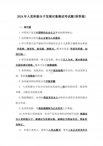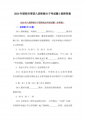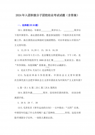 2024年入团积极分子团校结业考试试题(含答案)一、选择题(共30题)(B)1.团章规定,年龄在周岁以上,周岁以下的中国青年,承认团的章程,愿意参加团的一个组织并在其中积极工作,执行团的决议和按时交纳团费的,可以申请加入中国共产主义青年团。A.12,25B.14,28C.15,26D.16,28(B)2.1919年5月4日,北京爆发五四爱国运动。下午1时,北京13所高等学校的学生3000余名汇聚发表宣言,提出“外争国权,内惩国贼”的要求,然后举行示威游行。A.北京大学B.天安门C.北京师范大学(...