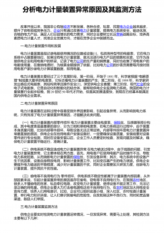分析电力计量装置异常原因及其监测方法 改革开放以来,我国非公有制经济不断发展,各种合资、私营、民营电力 企业 越来越多,提升了供电领域竞争压力,企业只有通过改善电力计量装置,提高电力系统安全,输送优质、合格的电力产品,满足人们日益增长的电力需求,同时企业要树立长远营销战略目标,培养高素质电力计量人才,找准企业发展方向,才能在竞争企业中脱颖而出。 一.电力计量装置作用和发展 电力计量装置是指记录电能使用情况的仪器或设备[1],包括各种型号的电能表,它在电力系统中占据重要地位,如果没有电力...