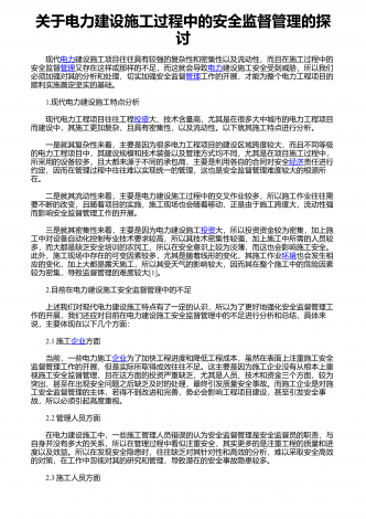 关于电力建设施工过程中的安全监督管理的探讨 现代电力建设施工项目往往具有较强的复杂性和密集性以及流动性,而且在施工过程中的安全监督管理又存在这样或那样的不足,而这就会导致电力建设施工安全受到威胁,所以我们必须加强对其的分析和处理,切实加强安全监督管理工作的开展,才能为整个电力工程项目的顺利实施奠定坚实的基础。 1.现代电力建设施工特点分析 现代电力工程项目往往工程投资大、技术含量高,尤其是在很多大中城市的电力工程项目而建设中,其施工更加复杂,且具有密集性,以及流动性。以下就其施工特点进行分...