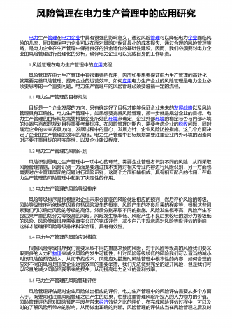风险管理在电力生产管理中的应用研究 电力生产管理在电力 企业 中具有很强的影响意义,通过风险管理可以降低电力企业面临风险的几率,同时确保电力企业可以在面对风险时保证最小的成本损失。通过合理的风险管理策略,是电力企业在生产管理中保持良好的资金运作的基础性建设。因而,我们必须要对电力企业的风险管理进行合理化的分析,确保电力企业可以完成自身的工作职责。 1 风险管理在电力生产管理中的应用流程 风险管理在电力生产管理中有很重要的作用,因而如果想要保证电力生产管理的高效化,就需要完善风险管理,提...