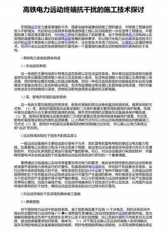 高铁电力远动终端抗干扰的施工技术探讨 在我国经济实力逐渐增强的今天,国家会越来越重视铁路工程的建设,对铁路工程建设的投入不断增加,先后将会出现很多新建高速铁路工程以及旧线路进一步改造等工程建设。不管是新建工程还是改建项目,均对电力供给方面提出了新的要求。由于传统高铁电力供电网以及采用的调度模式难以满足目前高铁运输发展的具体要求,所以现代化电力远动具体监控技术已经开始应用于高铁电力供电以及牵引供电中,这些新技术采用了自动化、计算机以及通信等技术。而评价该远动监控系统具有的可靠性的一个重要指标就是...
