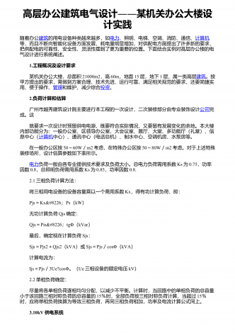 ――高层办公建筑电气设计某机关办公大楼设计实践随着办公建筑的用电设备种类越来越多,如电力、照明、电梯、空调、消防、通信、计算机等,而且不断向智能化设备方面发展,耗电量明显增加,对供配电方面提出了许多新的要求,把供配电的可靠性、安全性、灵活性摆到了更为重要的位置。下面结合实例对高层办公楼的电气设计进行系统阐述。1.工程概况及设计要求机关办公大楼,总面积21000m2,高60m,地面15层,地下1层,属一类高层建筑。按甲方提出的要求,需做到方案合理、技术先进、运行可靠、满足相关规范的要求,还要简捷实...