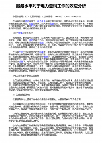 服务水平对于电力营销工作的效应分析 中图分类号:F274 文献标识码:A 文章编号:1006-8937(2016)08-0038-01 在当前的市场经济背景下,电力 企业 体制改革不断深化,开始参与到市场竞争中,面临着新的发展机遇和挑战,企业应该树立现代市场营销观念,完善优质服务工作标准体系,不断提升自身的服务水平,确保电力用户能够享受到优质的服务,从而帮助企业树立起良好的服务形象和市场信誉,推动企业的持续健康发展。 1 电力营销与服务水平 电力营销,是指在电力市场中,以电力客户的需...
