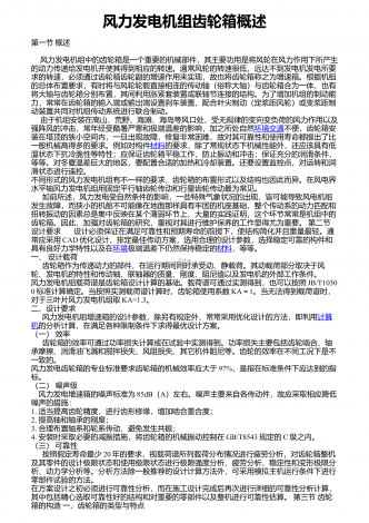 风力发电机组齿轮箱概述第一节概述风力发电机组中的齿轮箱是一个重要的机械部件,其主要功用是将风轮在风力作用下所产生的动力传递给发电机并使其得到相应的转速。通常风轮的转速很低,远达不到发电机发电所要求的转速,必须通过齿轮箱齿轮副的增速作用来实现,故也将齿轮箱称之为增速箱。根据机组的总体布置要求,有时将与风轮轮毂直接相连的传动轴(俗称大轴)与齿轮箱合为一体,也有将大轴与齿轮箱分别布置,其间利用涨紧套装置或联轴节连接的结构。为了增加机组的制动能力,常常在齿轮箱的输入端或输出端设置刹车装置,配合叶尖制动(...