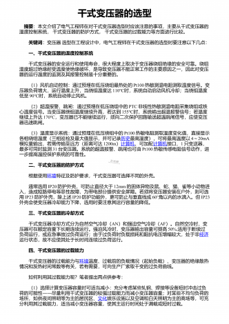 干式变压器的选型 摘要:本文介绍了电气工程师在对干式变压器选型时应该注意的事项,主要从干式变压器的 温度控制系统,干式变压器的防护方式,干式变压器的过载能力等方面进行比较。 关键词 :变压器选型在工程设计中,电气工程师在干式变压器的选型时要注意以下几点: 一、干式变压器的温度控制系统 干式变压器的安全运行和使用寿命,很大程度上取决于变压器绕组绝缘的安全可靠。绕组温度超过绝缘耐受温度使绝缘破坏,是导致变压器不能正常工作的主要原因之一,因此对变压器的运行温度的监测及其报警控制是十分重要的。...