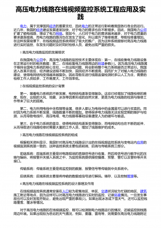 高压电力线路在线视频监控系统工程应用及实践 电力,属于支撑国民经济的重要支柱,因此电力的正常运行影响着我国各行各业的运行。近几年,我国的经济建设发展逐渐加快,对于电力的需求也在不断增多。因此,我国电力公司扩建了输电线路,增设了电力网络。现如今,人们对于电力的需求越来越多,对于电力质量的要求逐渐提高,而电力线路的路况也在发生了变化,所以提升了维修难度,导致检修量增加。在这种发展背景下,在线视频监控系统得到了极大的推广,因为这种系统能够对高压电力线路进行实时监控,在发生问题时及时同时检修人员,避免...