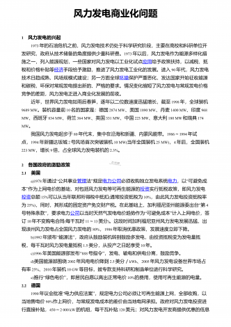 风力发电商业化问题1 风力发电的兴起1973年的石油危机之前,风力发电技术仍处于科学研究阶段,主要在高校和科研单位开发研究,政府从技术储备的角度提供少量科研费。1973年以后,风力发电作为能源多样化措施之一,列入能源规划,一些国家对风力发电以工业化试点应用给予政策扶持,以减税、抵税和价格补贴等经济手段给予激励,推进了风力发电工业化的发展。进入90年代,风力发电技术日趋成熟,风场规模式建设;另一方面全球环境保护严重恶化,发达国家开始征收能源和碳税,环保对常规发电提出新的、严格的要求。情况变化缩短了...