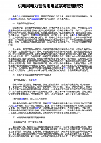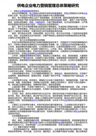 供电企业电力营销管理总体策略研究 一供电企业 营销 管理 的思想定位 首先应当明确的是,电力 营销 必须采取市场导向的管理模式,把电力营销定位为供电企业 的核心业务,电力的生产经营活动应服从和服务于电力营销的需要。 “”其次,电力营销的开展应立足于电网是基础,技术是支撑,服务和管理是保障的原则。“”应当充分利用目前两网改造的有利时机逐步解决供配电网络“”的瓶颈,满足广大用户的用电需求,运用先进的通信、网络、计算机技术,为客户提供高效的、全方位的优质服务,以严格 规范的管理对各项...