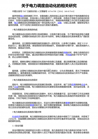 关于电力调度自动化的相关研究 中图分类号TM7 文献标识码A 文章编号1674-6708(2016)160-0176-02 虽然传统电力系统调度工作中,依靠调度人员的经验以及运行等方面对于电网调度的安全运行做出了极大的贡献,在培训新人方面也取得了一定的成果,但是由于传统方法的培训时间比较长,在现代化超高压智能化电网快速发展的今天,传统的电网调度工作已经无法满足实际需要,电力调度自动化系统能够实现一体化的电力生产、运输、分配以及消费,能够保证电力服务的质量,对于今后电力系统的安全运行是极...