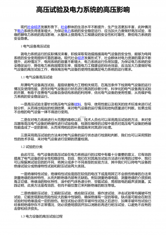 高压试验及电力系统的高压影响 现代社会 经济 发展形势下,社会群体的生活水平不断提升,生产生活更加丰富,此种情况下电力系统负荷逐渐增大,为保证电力系统的安全稳定运行,应当加大力度做好高压试验,准确把握电力系统的高压影响,从整体上提高电力工程建设的安全性和可靠性,降低电力系统的安全隐患。 1 电气设备高压试验 就电力系统运行的实际情况来看,积极采取有效措施提高电气设备的安全性,能够为电网系统的安全使用提供可靠的基础。现代社会经济发展形式下,社会群体对电力资源的需求不断提升,此种情况下,电...