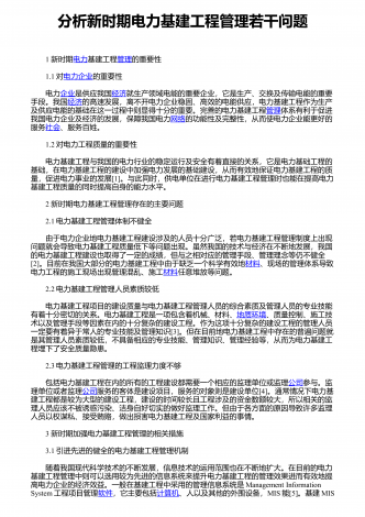 分析新时期电力基建工程管理若干问题 1 新时期电力基建工程管理的重要性 1.1对电力 企业 的重要性 电力企业是供应我国经济就生产领域电能的重要企业,它是生产、交换及传输电能的重要手段。我国经济的高速发展,离不开电力企业稳固、高效的电能供应,电力基建工程作为生产及供应电能的基础在这一过程中则显得十分的重要。完善的电力基建工程管理体系有利于促进我国电力企业及经济的发展,保障我国电力网络的功能性及完整性,从而使电力企业能更好的服务社会、服务百姓。 1.2对电力工程质量的重要性 电力基建...