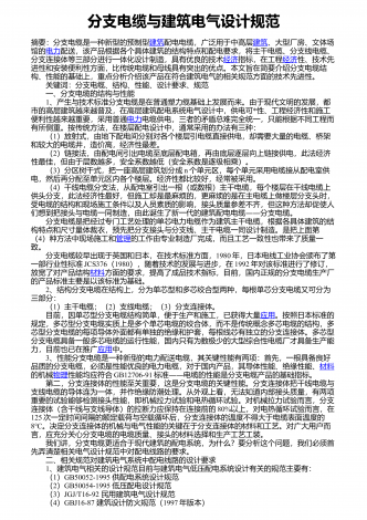 分支电缆与建筑电气设计规范摘要:分支电缆是一种新型的预制型建筑配电电缆,广泛用于中高层建筑、大型厂房、文体场馆的电力配送,该产品根据各个具体建筑的结构特点和配电要求,将主干电缆、分支线电缆、分支连接体等三部分进行一体化设计制造,具有优良的技术经济指标,在工程经济性、技术先进性和安装便利性方面,比传统电缆和母线具有突出的优点。本文旨在简要介绍分支电缆结构、性能的基础上,重点分析介绍该产品在符合建筑电气的相关规范方面的技术先进性。关键词:分支电缆、结构、性能、设计要求、规范一、分支电缆的结构与性能1...