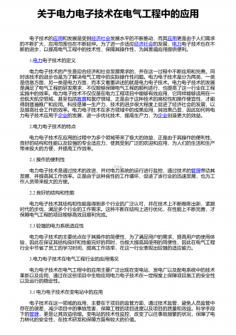 关于电力电子技术在电气工程中的应用 电子技术的应用和发展是受到经济 社会 发展水平的不断推动,而其应用更是由于人们需求的不断扩大,应用范围也在不断延伸。为了进一步适应经济 社会 的发展,电力电子技术也在不断的进步,以提高电气工程中的技术性,保障其操作性,为其普遍应用提供便利。 1.电力电子技术的定义 电力电子技术的产生是迎合经济和社会发展需求的,并在这一过程中不断应用和完善。同时该技术的进步也是为了解决电气工程中的实际操作性问题。电力电子技术是分为两类,一类是信息方面,另一类是电力...