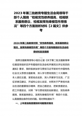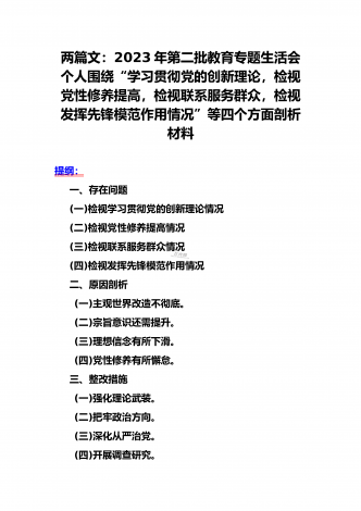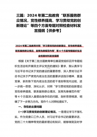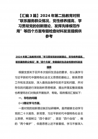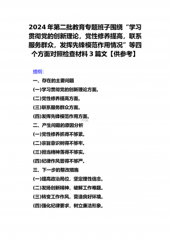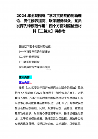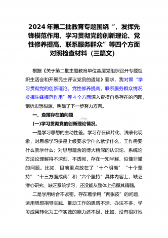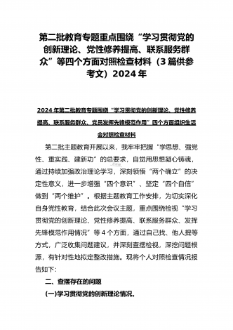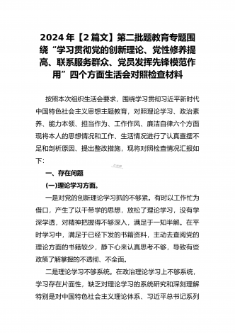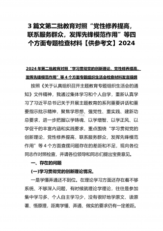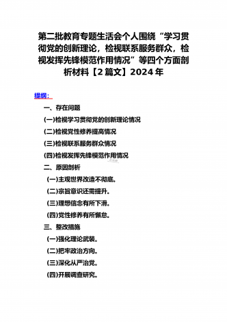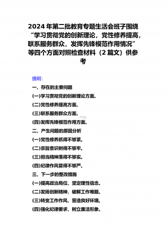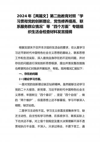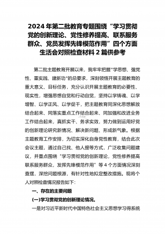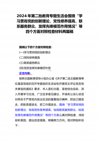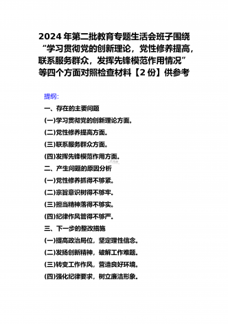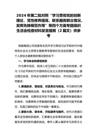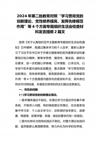 2024年第二批对照“学习贯彻党的创新理论,党性修养提高,联系服务群众情况,发挥先锋模范作用”等四个方面专题组织生活会检查材料发言提纲(2篇文)供参考