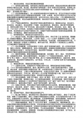 一、强化政治铸魂,夯实扛事担事的思想根基 (一)坚持政治建设领航。始终坚持以党的政治建设为统领,把政治标准和政治要求贯穿“”领导班子建设全过程、各方面,推动领导干部特别是一把手发挥示范引领作用,在思想上政“治上行动上自觉同以习近平同志为核心的党中央保持高度一致,引导党员干部坚定拥护两个”“”确立、坚决做到两个维护。 (二)抓实思想教育凝心。深入实施党的创新理论学习教育计划,把习近平新时代中国特色社会主义思想作为党员干部教育培训的首课、主课、必修课,举办学习贯彻习近平总书记视察重庆重要讲话...