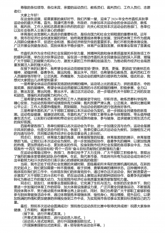 尊敬的各位领导、各位来宾,亲爱的运动员们、教练员们、裁判员们、工作人员们、志愿者们: 大家上午好! 在这金秋送爽、硕果累累的美好时节,我们齐聚一堂,迎来了2024年全市市直机关秋季运动会的盛大开幕。首先,我谨代表市委、市政府,向参加本次运动会的全体运动员、教练员、裁判员、工作人员和志愿者表示热烈的欢迎!向关心和支持本次运动会的各部门、各单位以及社会各界人士表示衷心的感谢! 体育是社会发展和人类进步的重要标志,是综合国力和社会文明程度的重要体现。近年来,我市在经济社会快速发展的同时,始终...