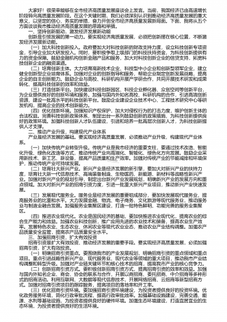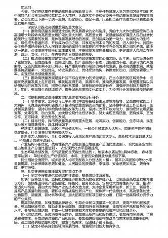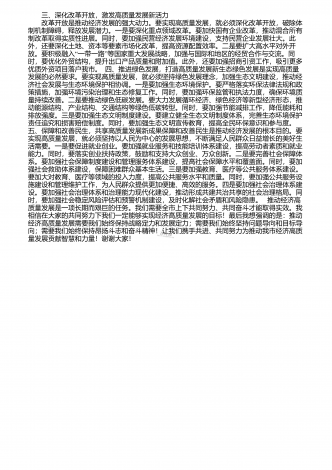 三、深化改革开放,激发高质量发展新活力 改革开放是推动经济发展的强大动力。要实现高质量发展,就必须深化改革开放,破除体制机制障碍,释放发展潜力。一是要深化重点领域改革。要加快国有企业改革,推动混合所有制改革取得实质性进展。同时,要加强民营经济发展环境建设,支持民营企业发展壮大。此外,还要深化土地、资本等要素市场化改革,提高资源配置效率。二是要扩大高水平对外开“”放。要积极融入一带一路等国家重大发展战略,加强与国际和地区的经贸合作与交流。同时,要优化外贸结构,提升出口产品质量和附加值。此外,...