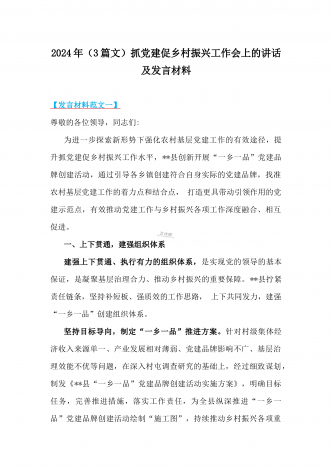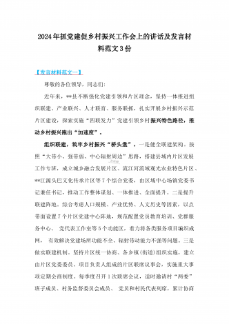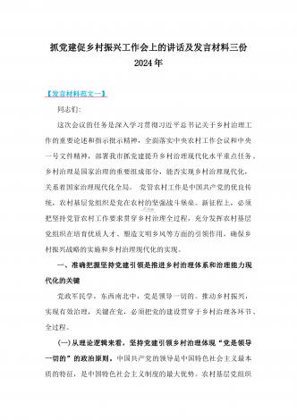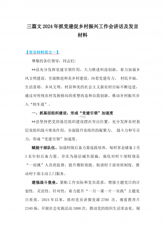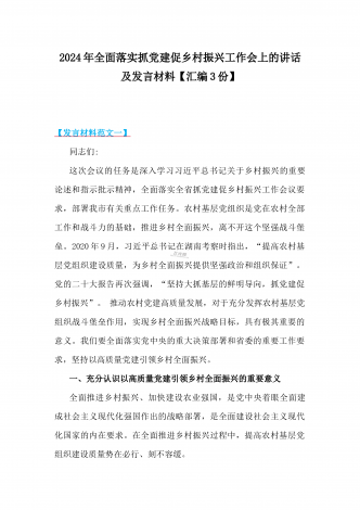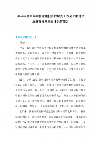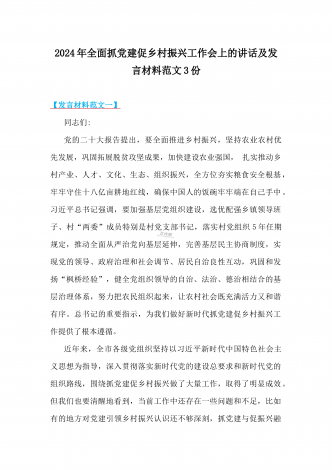 2024年全面落实抓党建促乡村振兴工作会上的讲话及发言材料三份【供借鉴】