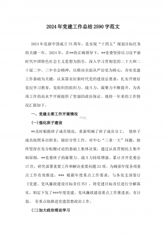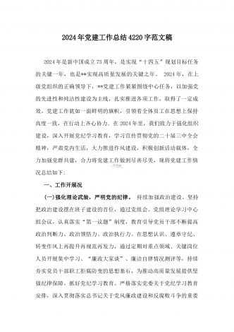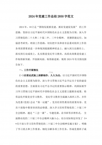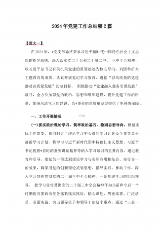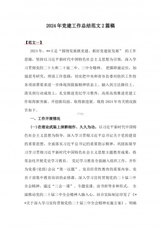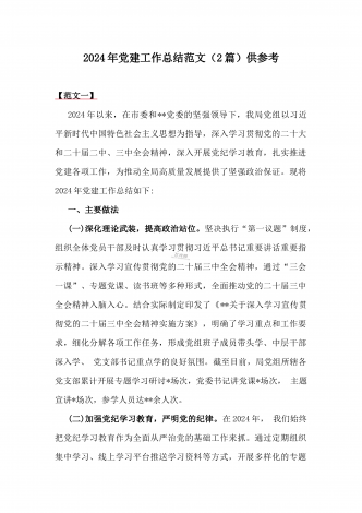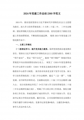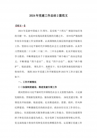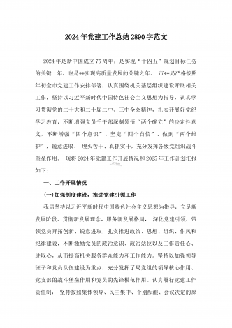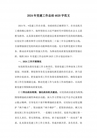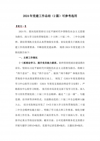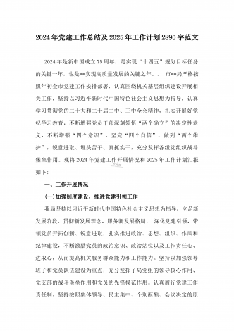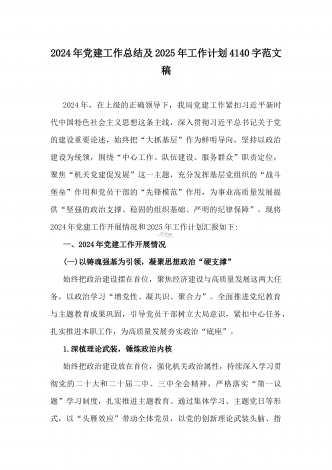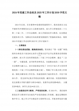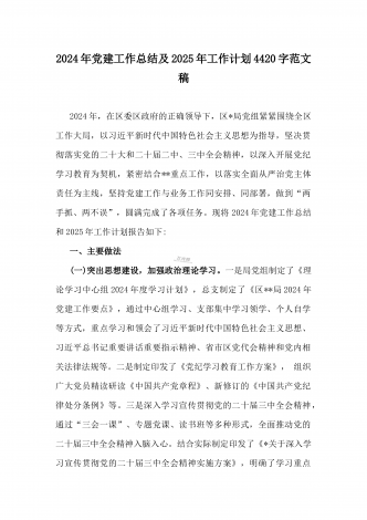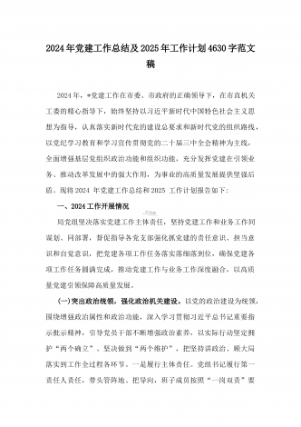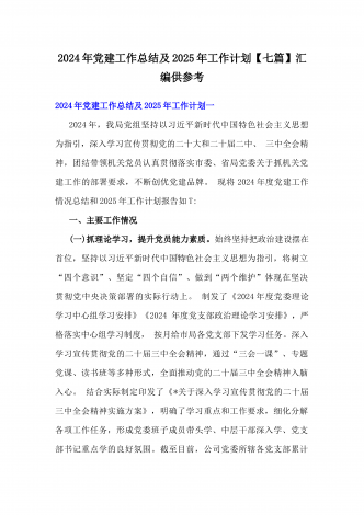 2024年党建工作总结及2025年工作计划【七篇】汇编供参考2024年党建工作总结及2025年工作计划一2024年,我局党组坚持以习近平新时代中国特色社会主义思想为指引,深入学习宣传贯彻党的二十大和二十届二中、三中全会精神,团结带领机关党员认真贯彻落实市委、省局党委关于抓机关党建工作的部署要求,不断创优党建品牌。现将2024年度党建工作情况总结和2025年工作计划报告如T:一、主要工作情况(一)抓理论学习,提升党员能力素质。始终坚持把政治建设摆在首位,坚持以习近平新时代中国特色社会主义思想为指引...