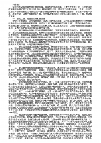 同志们: 法治是推动高质量发展的重要保障,是最好的营商环境。《中共中央关于进一步全面深化“”改革推进中国式现代化的决定》指出要创造更加公平、更有活力的市场环境。今天,我们在“”这里召开全市检察机关服务优化一流法治化营商环境数字化建设推进会,旨在进一步统一思想、凝聚共识,以数字检察为新引擎,全力推动我市法治化营商环境持续优化。下面,我讲几点意见。 一、提高认识,增强责任感和使命感 数字经济的健康、可持续发展离不开法治化的营商环境,及时总结和把握数字经济发展及“”“”数字经济执法的新趋势和...