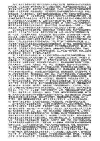 习近平总书记在庆祝全国人民代表大会成立70周年大会上的重要讲话,深刻阐述了人民代表大会制度的历史意义、显著优势和实践要求,为新时代坚持和完善人民代表大会制度、推进全过程人民民主建设指明了前进方向。通过深入学习领会讲话精神,我对做好新时代x县人大工作有了更深刻的认识。 人民代表大会制度是我国的根本政治制度,是实现我国全过程人民民主的重要制度载体。70年来,在中国共产党的领导下,人民代表大会制度不断发展完善,为我国经济社会发展和民主法治建设提供了根本政治保障。习近平总书记深刻指出,人民代表大会...