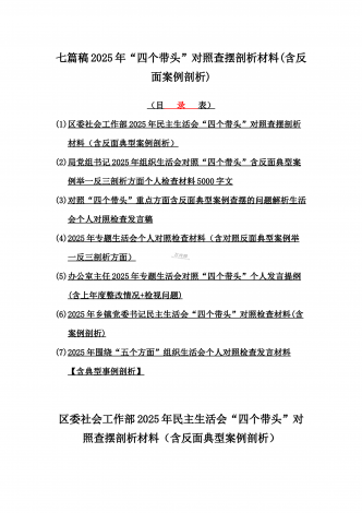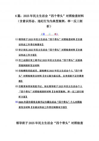 7篇:2025年带头严守政治纪律和政治规矩,“四个带头”对照检查剖析材料(含意识形态、以案为鉴反思、反面典型案例剖析)(目录表)1)市投资促进局党支部书记2025年组织生活会对照“四个带头”个人对照检查发言材料(含意识形态工作责任制落实方面)2)市税务局党委委员,副局长2025年民主生活会“四个带头”个人对照检视发言材料【含以案为鉴深刻反思,查找自身差距不足】3)市人防办领导班子2025年民主生活会“四个带头”对照检视剖析材料【含典型案例,举一反三剖析】4)市民政局领导班子2025年对照“四个带...
