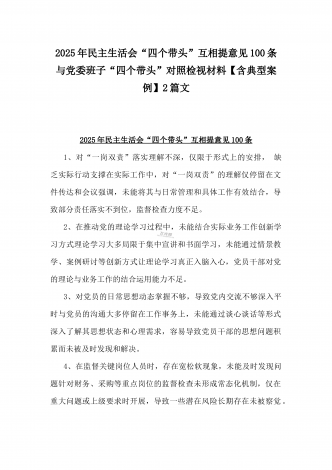2025年“四个带头”整改落实情况、意识形态工作、反面典型案例查摆对照发言材料与市教育体育局党组书记、局长领导班子“四个带头”对照检视剖析材料【含典型案例】2篇文2025年“四个带头”民主生活会个整改落实情况、意识形态工作、反面典型案例查摆人对照发言材料一、对照4个重点方面存在的主要问题(一)带头严守正治纪聿和正治规矩,维护团结方面存在的问题(二)带头严守纪聿、砥砺作风方面存在的问题(三)带头在遵规守纪、清正廉洁前提下勇于担责、敢于创新方面存在的问题(四)带头履行全面从严治存在的问题(五)整改落...