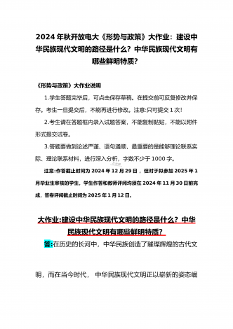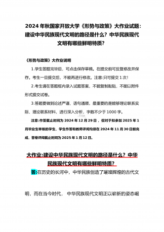 2024年秋国家开放大学《形势与政策》大作业:建设中华民族现代文明的路径是什么?中华民族现代文明有哪些鲜明特质?附答案【供参考】