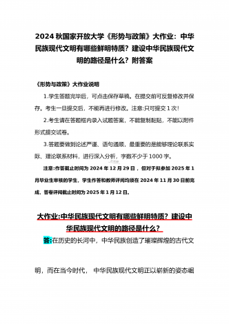 2024年秋国家开放大学《形势与政策》大作业:建设中华民族现代文明的路径是什么?中华民族现代文明有哪些鲜明特质?附答案【供参考】《形势与政策》大作业说明1.学生答题完毕后,可点击保存草稿。在提交前可反复修改并保存。考生一旦提交后,不能再进行修改。注意:只可提交1次!2.考生请在答题框内录入试题答案,不能复制黏贴,不能以附件形式提交试卷。3.答题要做到论述严谨、语句通顺,最重要的是能够理论联系实际、理论联系材料,进行深入分析,字数不少于1000字。注意:作答截止时间为2024年12月29日,但对于...