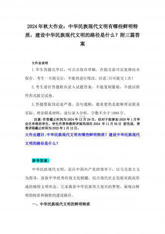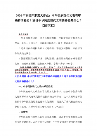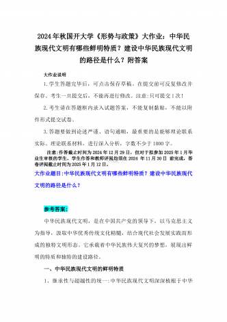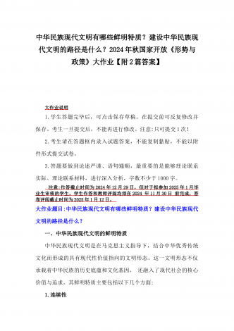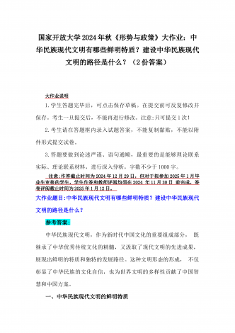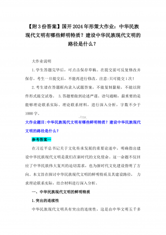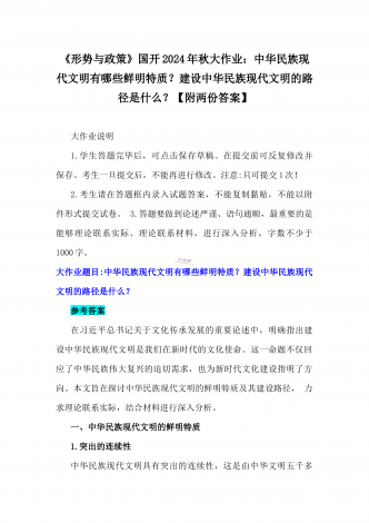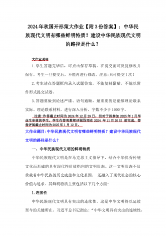 2024年秋国家开放大学《形势与政策》大作业:中华民族现代文明有哪些鲜明特质?建设中华民族现代文明的路径是什么?【附3份参考答案】供参考