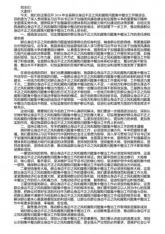 同志们: 大家好! 今天,我们在这里召开2024年全县群众身边不正之风和腐败问题集中整治工作推进会,目的是为了深入贯彻落实习近平总书记关于加强党风廉政建设和反腐败斗争的重要指示精神,全面落实党中央、国务院关于加强基层治理体系和治理能力现代化建设的决策部署,总结交流我县群众身边不正之风和腐败问题集中整治的经验做法,研究部署下一步工作,推动我县群众身边不正之风和腐败问题集中整治工作再上新台阶。 一、提高政治站位,切实增强做好群众身边不正之风和腐败问题集中整治工作的责任感和使命感 群众身边...