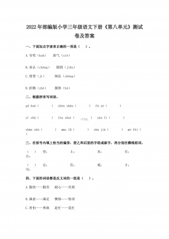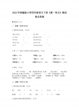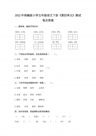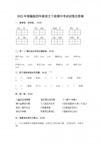 2022年部编版小学六年级语文下册期中达标综合测试卷及答案一、根据语境,看拼音写词语。(8分)1.春节zhă yn(ă )就到了,家家户户贴春联,ránfàng( )biānpào( ),十分热闹。2.鲁滨逊虽liú luò( )在荒岛,但他一点儿也不kngjù(ŏ ),勇敢地挑战困难,战胜自我。3.他一边fānxiāngdoguì(ă ),一边niàndao( )着:“我的笔记本到哪里去了呢?二、完成词语练习。(8分)1.将下列四字词语补充完整,...