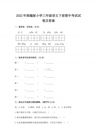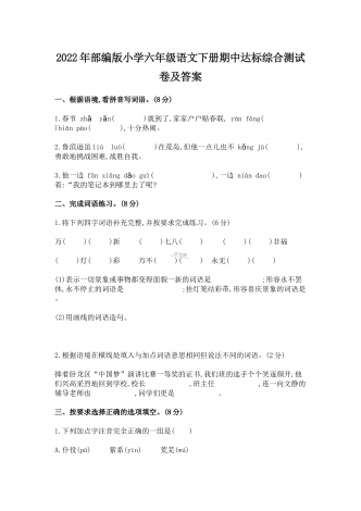 2022年部编版小学六年级语文下册期中达标综合测试卷及答案