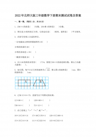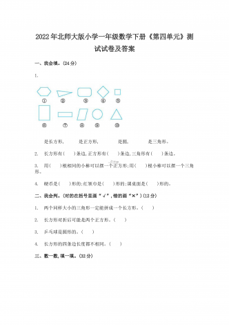 2022年北师大版小学一年级数学下册《第四单元》测试试卷及答案一、我会填。(24分)1. 是长方形, 是正方形, 是圆, 是三角形。 2. 长方形有( )条边,正方形有( )条边,三角形有( )条边。3. 用( )根相同的小棒可以摆一个正方形;用( )根小棒可以摆一个三角形。4. 硬币是( )形的;红领巾是( )形的;课桌面是( )形的。二、我会判。(对的在括号里画“√”,错的画“”✕)(12分)1. 两个同样大小的三角形一定能拼成一个长方形。( )2. 长...