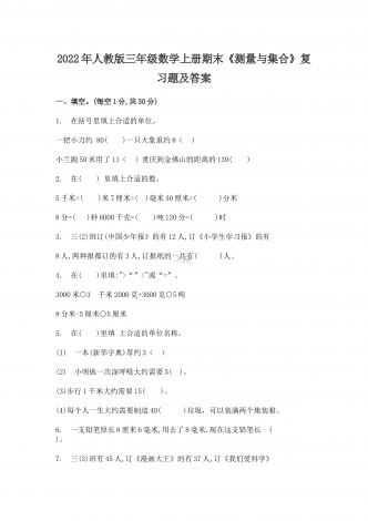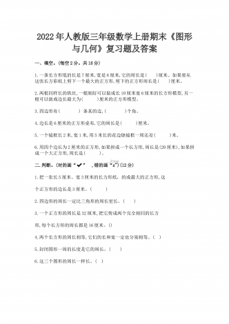2022年人教版三年级数学上册期末《图形与几何》复习题及答案一、填空。(每空2分。共18分)1.一条长方形坻的长是7厘米,宽是6厘米,它的周长是( )厘米。如果要从这张长方彩纸上剪下一个最大的正方形,剪下的正方形周长是( )厘米。2.两根同样长的铁丝,一根刚好可以做成长10厘米宽6厘米的长方形模型,另一根可以做成边长最大为( )厘米的正方形模型。3.四边形有( )条真的边,( )个角。4.边长是6厘米的正方形桌布,它的周长是( )厘米。5.一个镜框长2米,宽1米,用5米长...