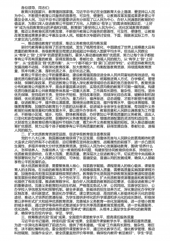 各位领导、同志们: 教育兴则国家兴,教育强则国家强。习近平总书记在全国教育大会上强调,要坚持以人民为中心,不断提升教育公共服务的普惠性、可及性、便捷性,让教育改革发展成果更多更公平惠及全体人民。习近平总书记的重要讲话充分体现了以人民为中心、办好人民满意的教育的价“”“值追求,为我们深入促进教育公平指明了方向。人民群众有学上的需求得到满足后,上好”学成为当前教育突出的矛盾和问题。教育部门要坚持以人民为中心,优化区域教育资源配置,推动义务教育优质均衡发展,不断提升教育公共服务的普惠性、可及性、...