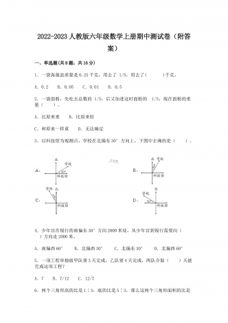 浙江省温州市2022-2023六年级数学上册期中测试卷(附答案)