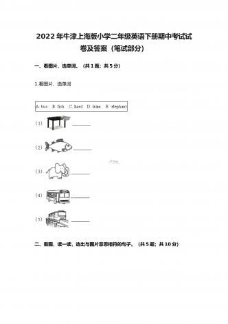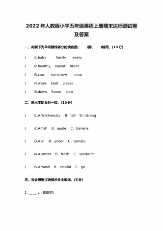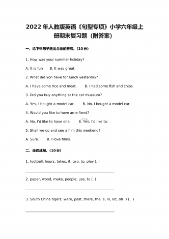 2022年人教版小学五年级英语《阅读理解》上册期末专项复习试题及答案
