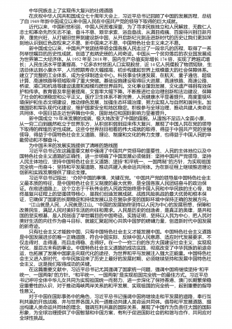 中华民族走上了实现伟大复兴的壮阔道路 在庆祝中华人民共和国成立七十周年大会上,习近平总书记回顾了中国的发展历程,总结了自1949年新中国成立以来中国人民在中国共产党的领导下取得的巨大成就。 近代以来,中国积贫积弱,中国人民苦难深重,为了寻求民族独立和人民解放,无数仁人志士和革命先烈矢志不渝、奋斗不息、艰辛求索、浴血奋战,从满目疮痍、百废待兴到日新月异、蓬勃兴旺,从打破旧世界到建设新中国,从开启新纪元到走进新时代的历史让我们更加深刻地认识到红色政权来之不易、新中国来之不易、中国特色社会...