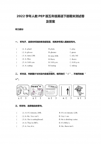 2022-2023学年人教版小学四年级英语下册期末质量预测卷及答案一、听音,选择听到的内容(5分).听录音,选出你听到的单词。 . . . . . . . . . . . . . . .二、听音,选择正确答案(10分).听录...