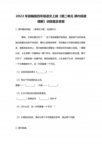 2022年部编版四年级语文上册《第二单元课内阅读理解》训练题及答案1.课内精彩回放。(读课文片断,完成练习) “真的,它现在要开花了!”这个母亲慢慢开始相信,她的孩子会好起来。她记起最近这孩子讲话时,要比以前愉快得多,而且最近几天她也能自己爬起来,直直地坐在床上,用兴奋的眼光望着这一粒豌豆所形成的小花园。一星期以后,小女孩第一次能够坐一整个钟头。她快乐地坐在温暖的太阳光里。窗子打开了,它面前是一朵盛开的、紫色的豌豆花。小女孩低下头来,轻轻地吻了一下它柔嫩的叶子。这一天简直像一个节日。(1)这段...