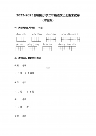 2022-2023部编版小学二年级语文上册期末试卷(附答案)一、我会读拼音,写词语。(16分)二、选字组词。(填序号)(8分)①戴 ②带( )领 ( )眼镜①已 ②以( )经 ( )前①壮 ②状( )丽 形( )①对 ②队排( ) ( )错三、读一读,连一连。(10分)四、我会填一填。(6分)如鱼( )( ) ( )穷( )尽 名( )大( )( )言( )语 ( )光( )色 ( )色满( )五、根据形声字形旁表意的特点,选择正确的字填空。(填序...