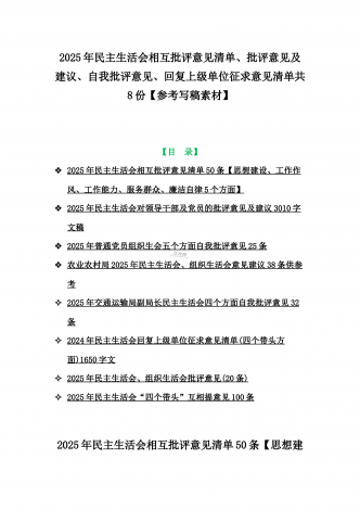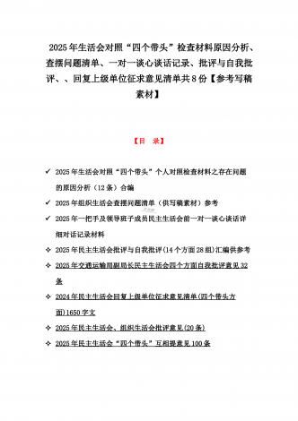 2025年生活会对照“四个带头”检查材料原因分析、查摆问题清单、一对一谈心谈话记录、批评与自我批评、、回复上级单位征求意见清单共8份【参考写稿素材】【目录】2025年生活会对照“四个带头”个人对照检查材料之存在问题的原因分析(12条)合编2025年组织生活会查摆问题清单(供写稿素材)参考2025年一把手及领导班子成员民主生活会前一对一谈心谈话详细对话记录材料2025年民主生活会批评与自我批评(14个方面28组)汇编供参考2025年交通运输局副局长民主生活会四个方面自我批评意见32条2...
