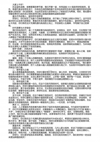 大家上午好! 在这金秋送爽、硕果累累的季节里,我们齐聚一堂,共同迎接2024级新同学的到来。首先,我谨代表全校师生员工,向来自五湖四海的数千名本科和研究生新生表示最热烈的欢迎和最衷心的祝贺!你们的到来,为这所历史悠久的学府注入了新的活力与希望。同时,我也要向辛勤培育你们成长的父母和老师们致以崇高的敬意和诚挚的感谢! 星光不负赶路人,韶华终许追梦者 同学们,你们经历了无数个日夜的寒窗苦读,终于踏入了梦寐以求的大学校门。这不仅仅是对你们过去努力的肯定,更是对未来无限可能的期许。星光不负赶路...