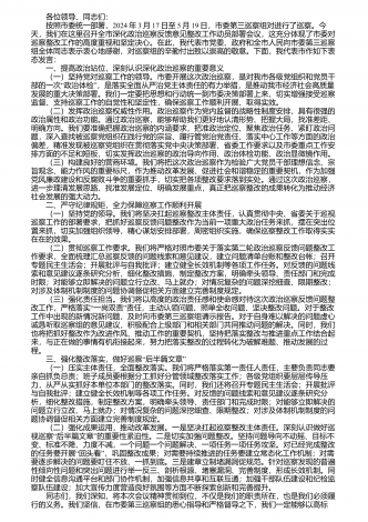 各位领导、同志们: 按照市委统一部署,2024年3月17日至5月19日,市委第三巡察组对进行了巡察。今天,我们在这里召开全市深化政治巡察反馈意见整改工作动员部署会议,这充分体现了市委对巡察整改工作的高度重视和坚定决心。在此,我代表市党委、政府和全市人民向市委第三巡察组全体同志表示衷心地感谢,对巡察组的辛勤付出致以崇高的敬意。下面,我代表市作如下表态发言: 一、提高政治站位,深刻认识深化政治巡察的重要意义 (一)坚持党对巡察工作的领导。市委开展这次政治巡察,是对我市各级党组织和党员干“”...