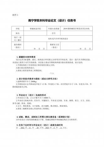 附件3南宁学院本科毕业论文(设计)任务书学院智能制造学院年级专业班级2019级机械设计制造及其自动化姓名学号设计(论文)题目双柱式汽车举升机的设计指导教师(签名)年月日教研室主任(签名)年月日1.课题的内容和要求综合运用3D建模、液压、机构设计和有限元分析等多学科技术,设计一款汽车升降机设备,该设备主要用于对汽车的检修。该设备主要由升降机构和液压驱动系统组成。设计包括:1.升降机构的工作原理设计和结构的有限元分析;2.液压驱动系统的设计;3.系统主要零部件的工程图绘制。2.设计的技术要求与指标(...