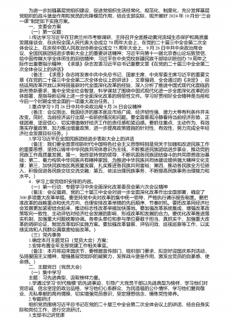 2024年第四季度,局机关党支部将围绕党的二十大精神和中央、省委、市委的决策部署,“”结合机关工作实际,深入落实三会一课制度,加强党员教育管理,提升党支部的凝聚力和战斗力。通过内容丰富、形式多样的组织生活,进一步坚定党员理想信念,增强党性修养,提升服务群众的能力和水平,为推进我局各项工作高质量发展提供坚强的组织保障。 二、主要内容和时间安排 (一)支部党员大会 会议主题:学习党的二十大精神,总结第三季度工作,部署第四季度任务 时间安排:2024年10月10日 主要内容: 组织全体...