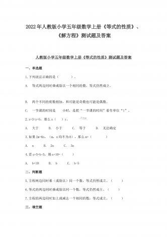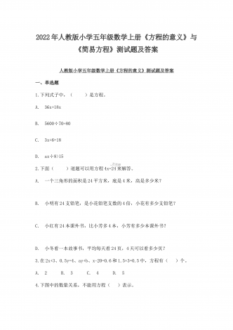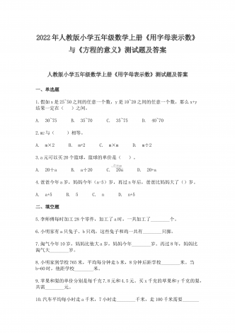 2022年人教版小学五年级数学上册《实际问题与方程》与《用字母表示数》测试题及答案