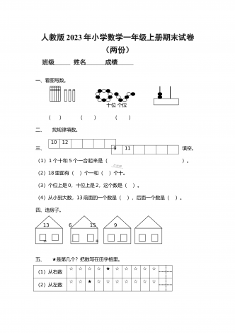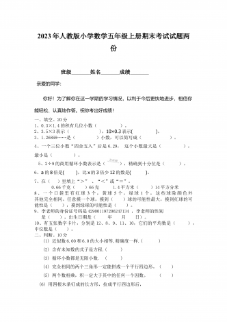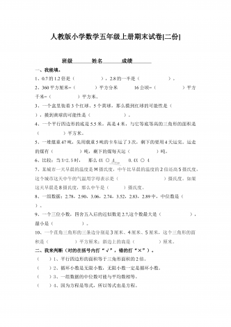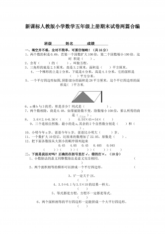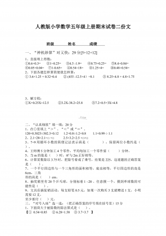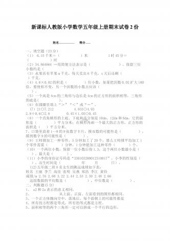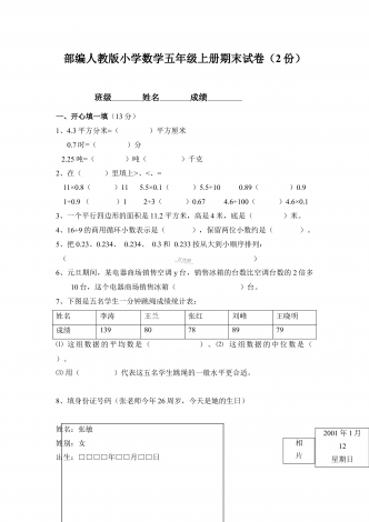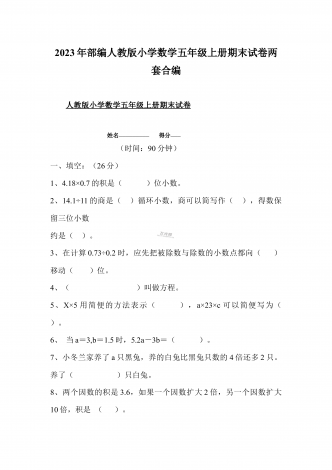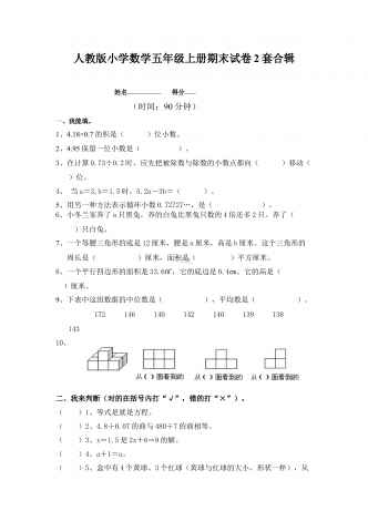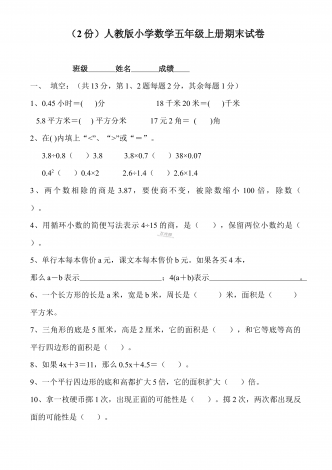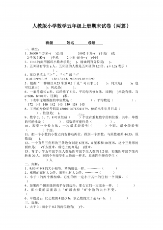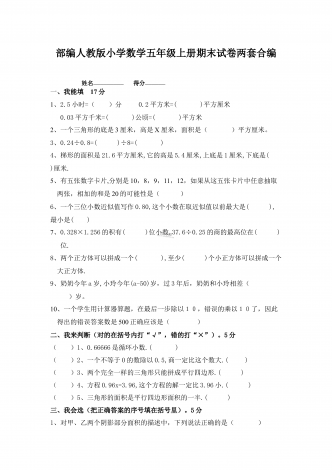 部编人教版小学数学五年级上册期末试卷两套合编