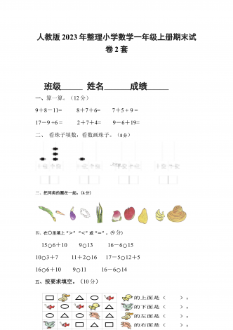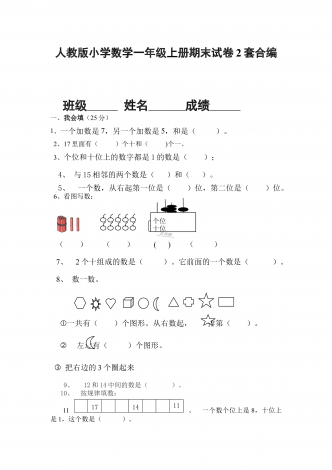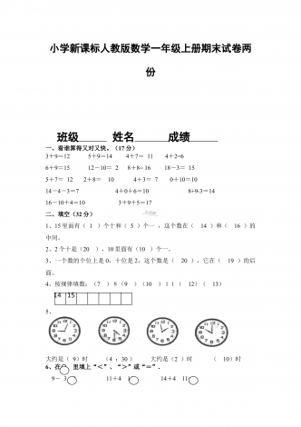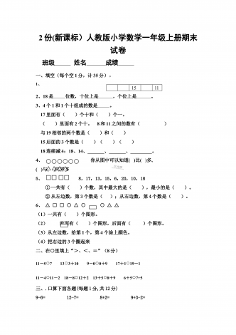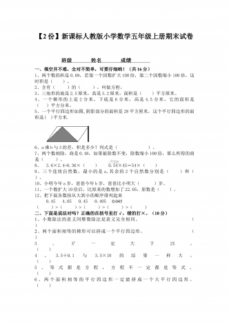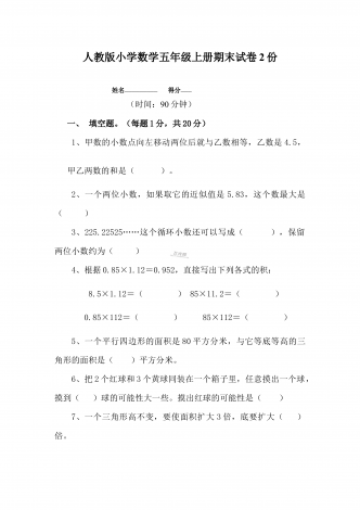 部编人教版小学数学五年级上册期末试卷两套合编姓名—————————得分——————一、我能填17分1、2.5小时=()分0.2平方米=()平方厘米0.03平方千米=()公顷=()平方米2、一个三角形的底是3厘米,高是X厘米,面积是()平方厘米。3、0.24÷0.8=()÷8=()4、梯形的面积是21.6平方厘米,它的高是5.4厘米,上底是1厘米,下底是()厘米.5、有五张数字卡片,分别是10,8,9,11,12,如果从这五张卡片中任意抽取两张,相加的和是20的可能性是()6、一个三位小数近似值写...